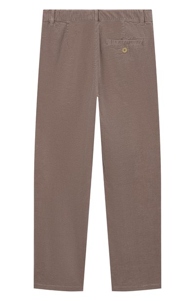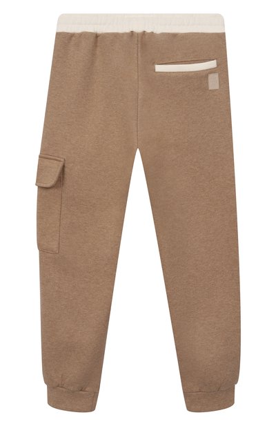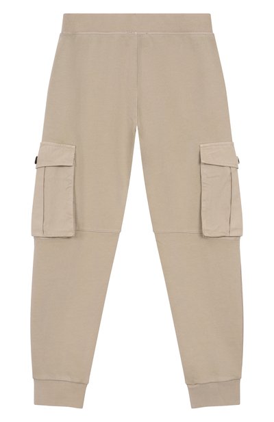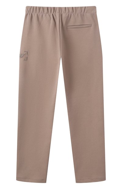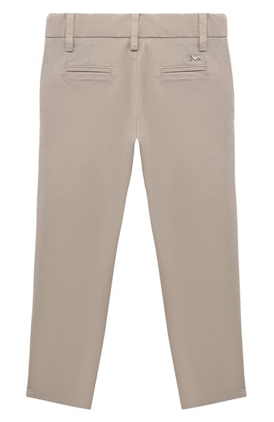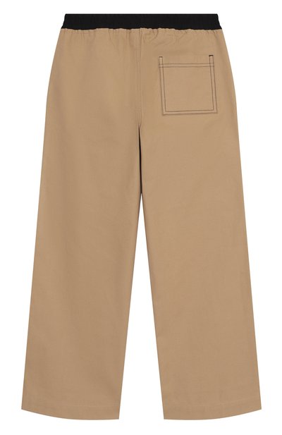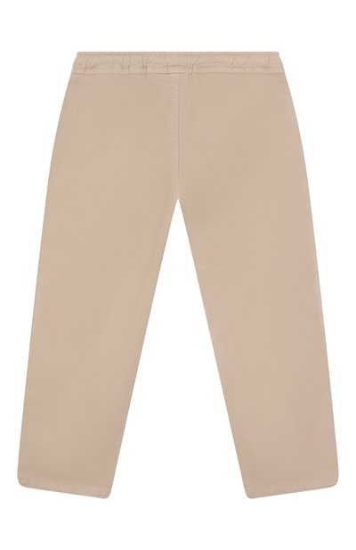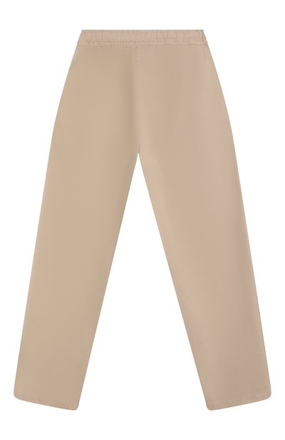 Для изготовления брюк с вышитым сзади логотипом использовали стрейчевый хлопковый твил. Изделие с эластичной вставкой на поясе и отворотами дополнили боковыми и прорезными задними карманами.
