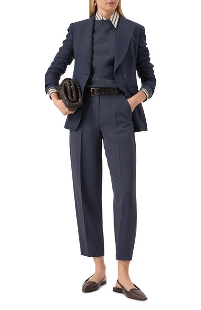Свитер кроя Relaxed fit украсили миниатюрными пайетками, вплетенными в пряжу из кашемира с добавлением шелка. Широкую V-образную горловину, манжеты и пояс выполнили в рубчик.