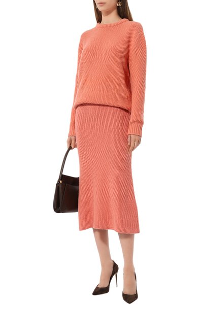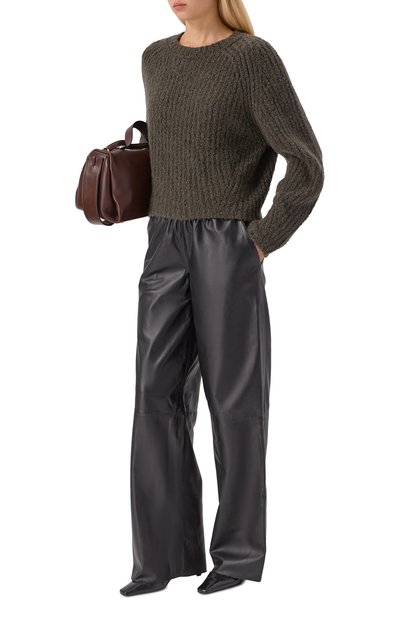 Свободный свитер с круглой горловиной в рубчик и спущенной линией плеч связали английской резинкой из чистого кашемира. Отвороты на манжетах украсил петлями, расшитыми цепочкой мониль.