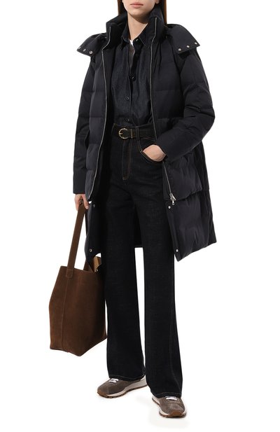 Стеганый пуховик с отложным воротником и съемным капюшоном сшили из влагоотталкивающей тафты на основе полиэстера и хлопка. Утепленное материалом Thermore® пальто на гусином пуху дополнили эластичными манжетами, кулиской по низу, врезными нагрудными и накладными боковыми карманами. Под штормовой планкой на кнопках скрыли встречную молнию с цепочкой мониль на верхнем пуллере.