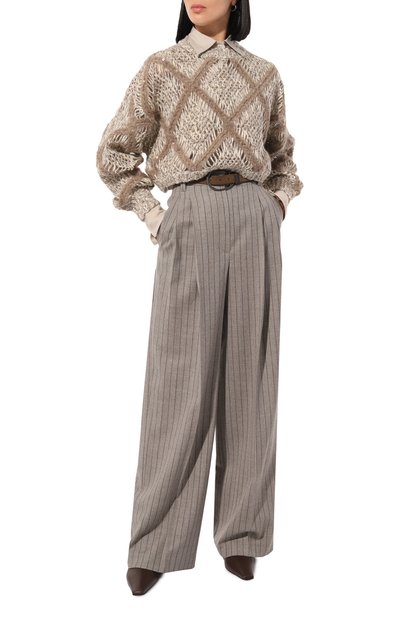 Свитер со спущенной линией плеч связали из ворсованной пряжи на основе мохера, полиамида и шерсти. Модель расшили цветными пайетками в технике деграде, а эластичные манжеты, пояс и горловину оставили без декора.
