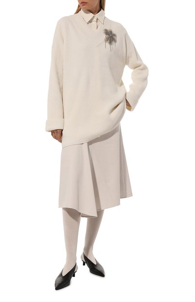 Платье-свитер со спущенной линией плеч связали резинкой из кашемировой пряжи. Модель дополнили более длинным нижним платьем-рубашкой с воротником аскот, сшитым из тонкого смесового трикотажа.