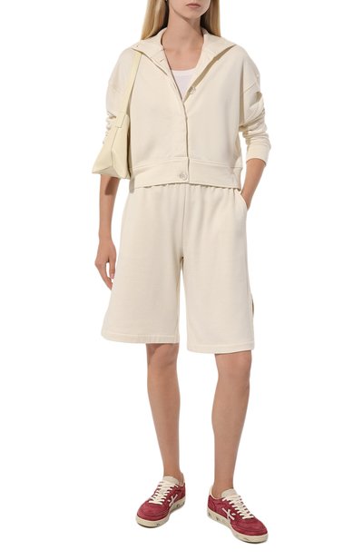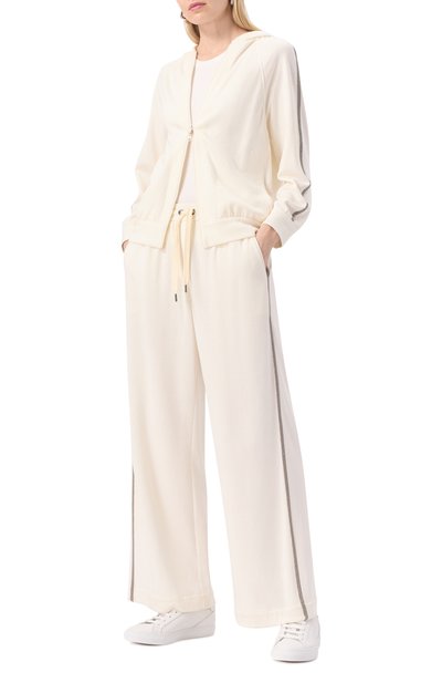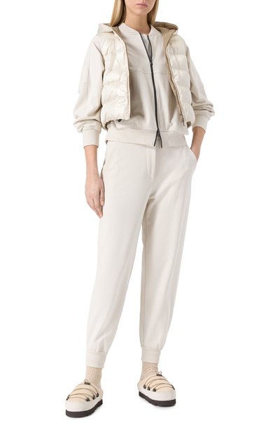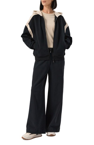 В коллекцию Travelwear включили толстовку из френч терри Smooth на основе чистого хлопка. Капюшон с атласным подкладом подчеркнули кантом из фирменной цепочки мониль, а по бокам предусмотрели врезные карманы с листочками. Модель со свободными манжетами и поясом застегивается встречной молнией.