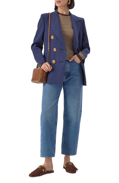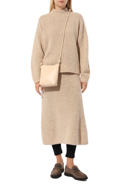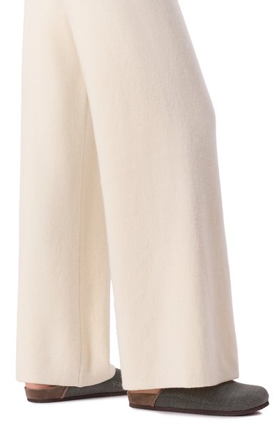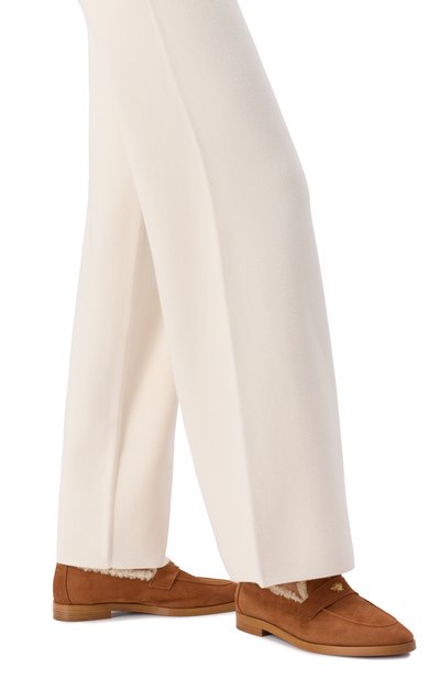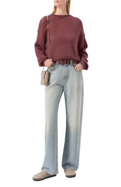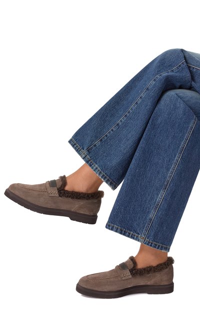 Сабо на широкой резиновой подошве выполнили из замши, а для внутренней отделки модели использовали овчину. Союзку изделия дополнили ремешком с пряжкой, украшенной фирменными цепочками мониль.