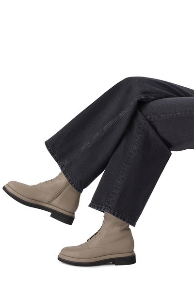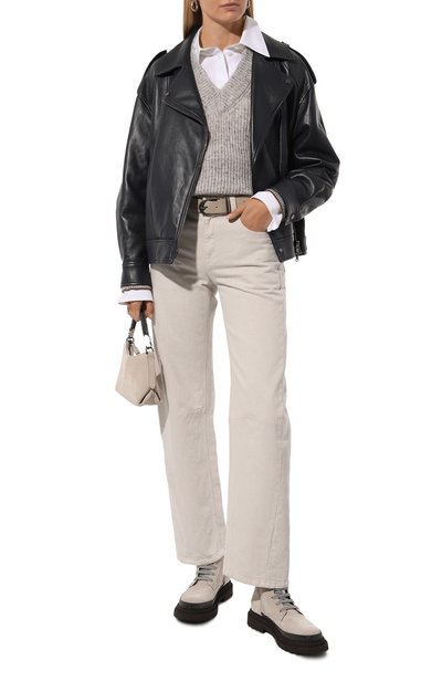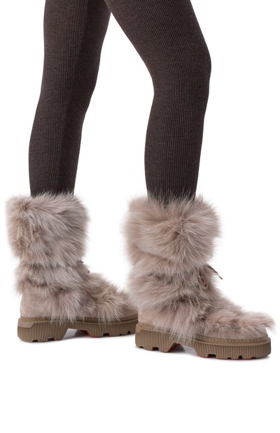 Замшевые ботинки на широкой протекторной подошве утеплили густой овчиной. Модель на шнуровке и молнии украсили петлей из цепочек мониль на голенище сзади.