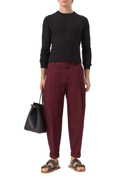 Для изготовления джемпера в рельефную полоску использовали шерстяной трикотаж с добавлением кашемира и вискозы. Горловину, манжеты и пояс изделия выполнили в рубчик.