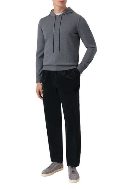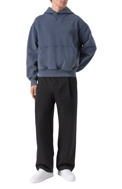 Для изготовления худи с регулируемым капюшоном использовали трикотаж из чистой шерсти. Широкие эластичные манжеты и пояс модели выполнили в рубчик.