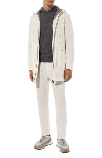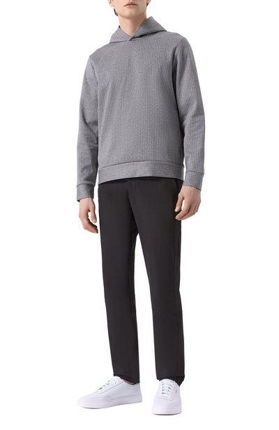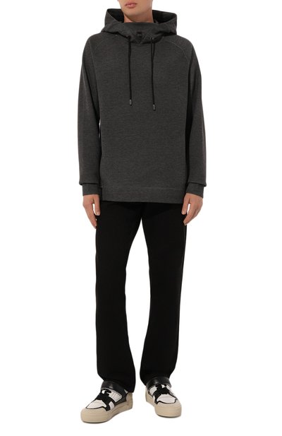 Для изготовления худи с регулируемым капюшоном использовали трикотаж из чистой шерсти. Широкие эластичные манжеты и пояс модели выполнили в рубчик.