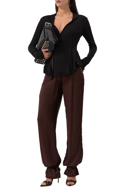 Брюки с четырьмя карманами выполнили из стрейчевой шерсти с добавлением кашемира. Посадка модели на талии регулируется шнурком с люрексом, продетым в широкий пояс-кулиску.