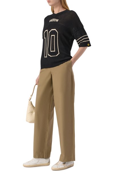 Брюки с четырьмя карманами выполнили из стрейчевой шерсти с добавлением кашемира. Поса дка модели на талии регулируется шнурком с люрексом, продетым в широкий пояс-кулиску.
