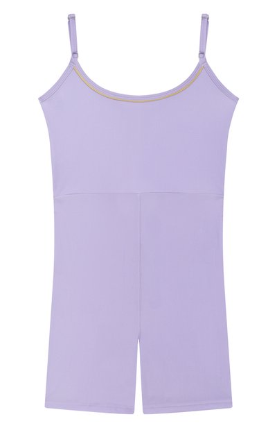 Облегающий комбинезон выполнили из стрейчевого материала на основе полиэстера. Круглый вырез модели с узкими регулируемыми бретелями подчеркнули контрастным кантом.
