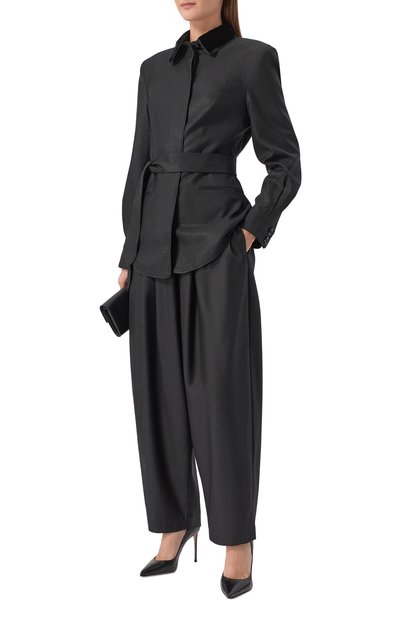 Брюки изготовили из выделанной вручную кожи ягненка оттенка Chocolate. Модель дополнили боковыми карманами, а пояс — шлевками для ремня.
