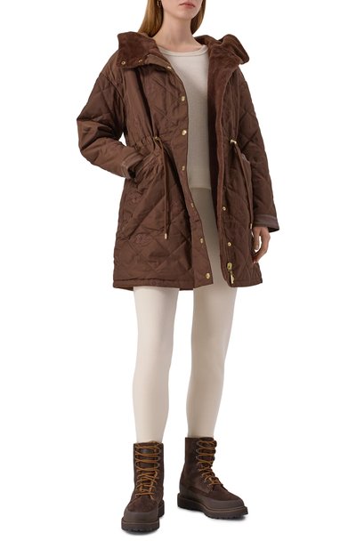 Oversize-парку с потайным поясом-кулиской и асимметричным низом изготовили из хлопкового твила оттенка Chocolate. Модель дополнили тремя парами карманов и фигурным ремешком, трансформирующим съемный отложной воротник в стойку. Молнию изделия скрыли под штормовой планкой.