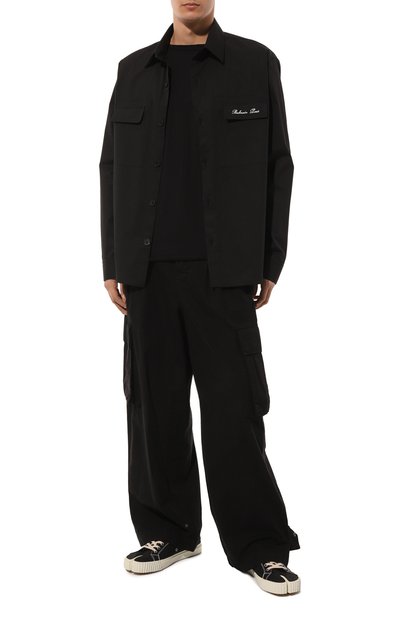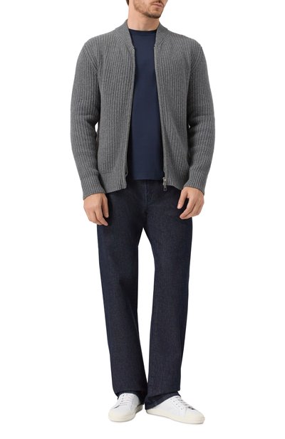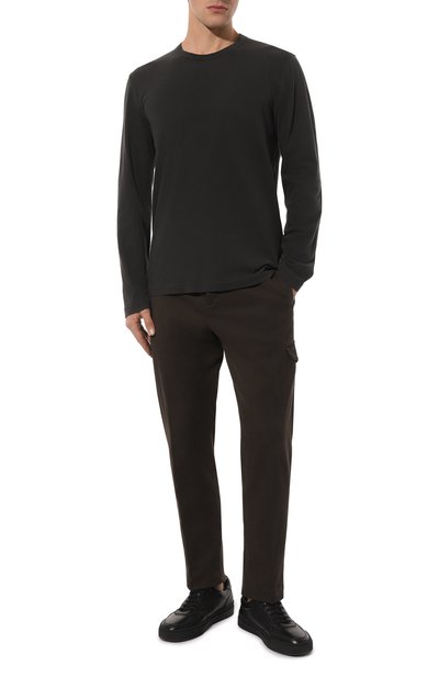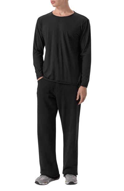 Базовый лонгслив с круглой горловиной в рубчик выполнили из гладкого хлопкового трикотажа. На спинке модель декорировали небольшим контрастным логотипом марки.