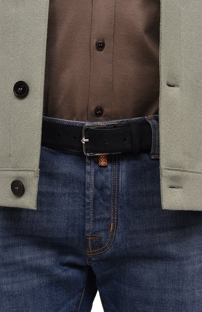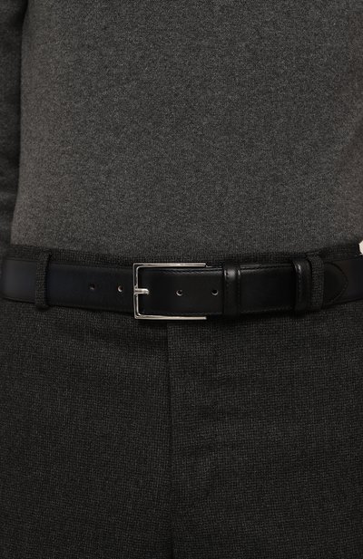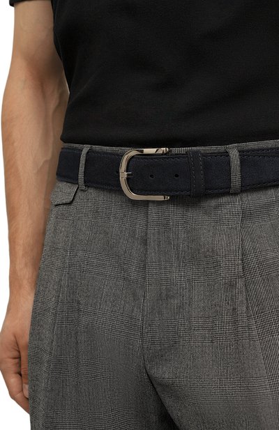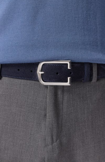 Широкий ремень с одним тренчиком сшили вручную из замши. Аксессуар с брендированной металлической пластиной дополнили фигурной пряжкой с зеркальным финишем.
