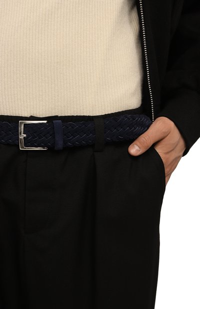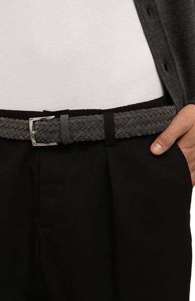 Ремень выполнен вручную из комбинации замши, акрила и шерсти. Аксессуар с тисненой эмблемой марки дополнен металлической пряжкой с зеркальным финишем.
