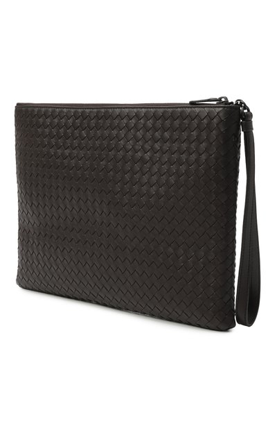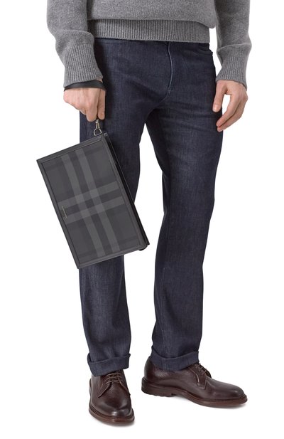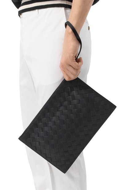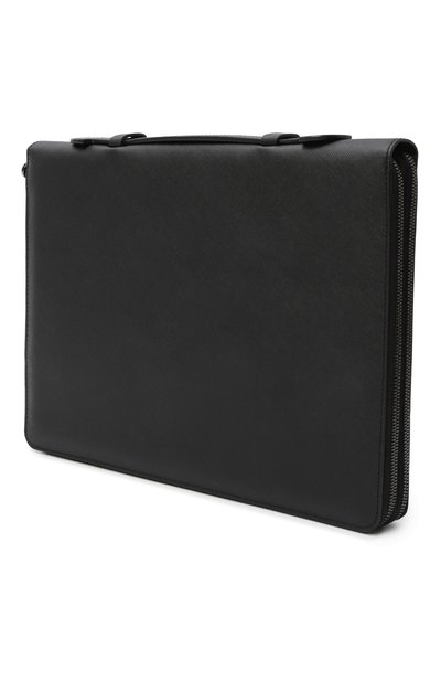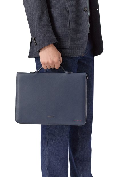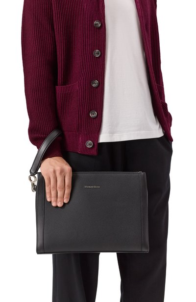 Папку для документов выполнили из матовой зернистой кожи. Спереди изделие украсили рельефным логотипом бренда. Сама модель со съемной ручкой-петлей, как и внутренний карман, застегивается молнией.