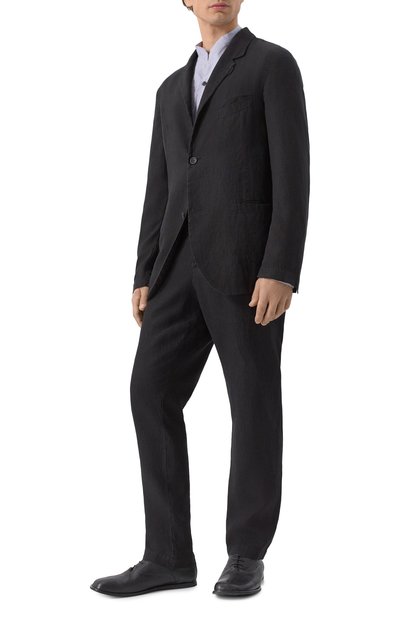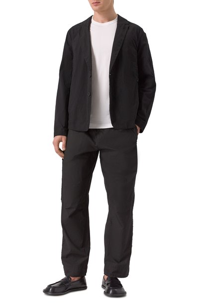 Однобортный пиджак с широкими лацканами сшит из эластичного микса полиэстера и вискозы. Модель со шлицей и тремя врезными карманами украшена фирменным патчем сзади.