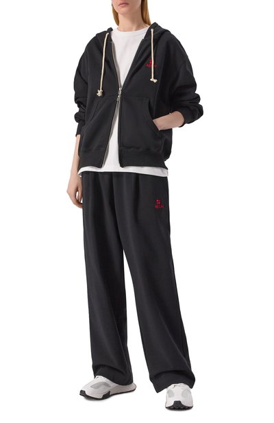 Толстовку со спущенной линией плеч и нерегулируемым капюшоном выполнили из хлопкового трикотажа с добавлением полиэстера. Спереди модель с двумя накладными карманами и отделкой в рубчик декорировали контрастным логотипом.