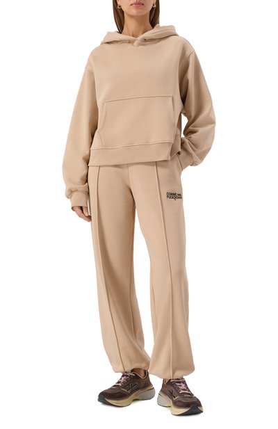 Худи с карманом «кенгуру» выполнили из хлопкового трикотажа с добавлением полиэстера. Модель с рифлеными манжетами и поясом украсили логотипом спереди.