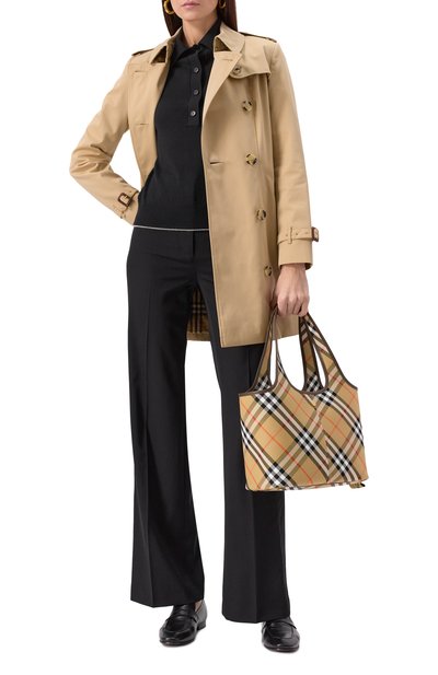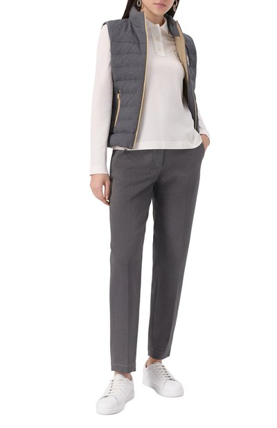 Поло с длинными рукавами выполнили из микса модала и хлопка. Воротник, манжеты и пояс подчеркнули контрастными полосками. Спереди модель с короткой пуговичной планкой украсили вышивкой.