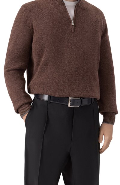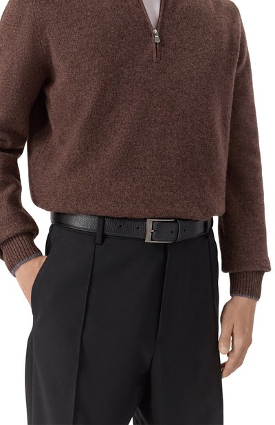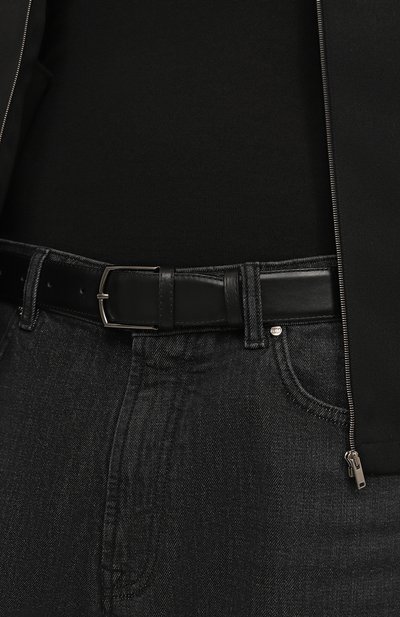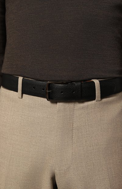 Ремень стандартной ширины выполнили из мелкозернистой кожи. Аксессуар с двумя тренчиками и пряжкой из серебристого металла декорировали заклепкой с выгравированной эмблемой марки.