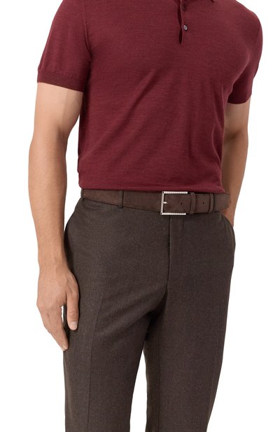 Широкий ремень с одним тренчиком сшили из замши. Аксессуар дополнили фирменной заклепкой и металлической пряжкой с выгравированными эмблемами марки.
