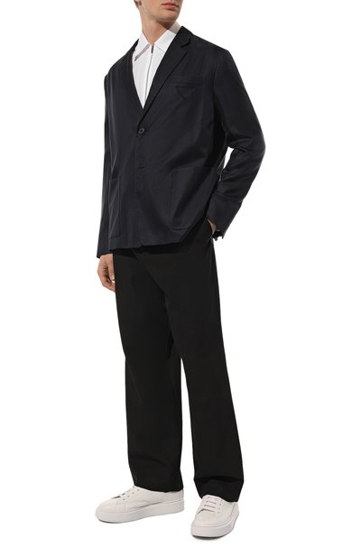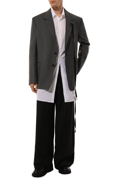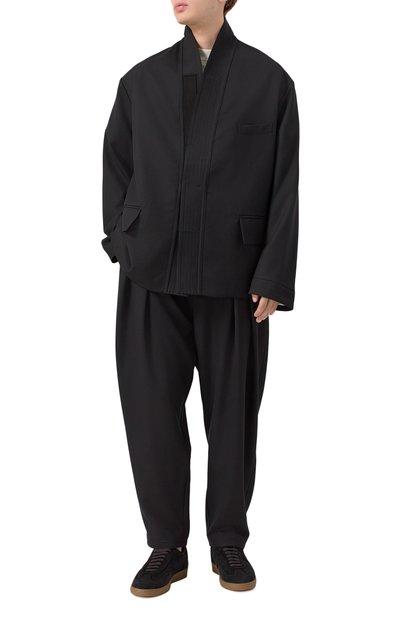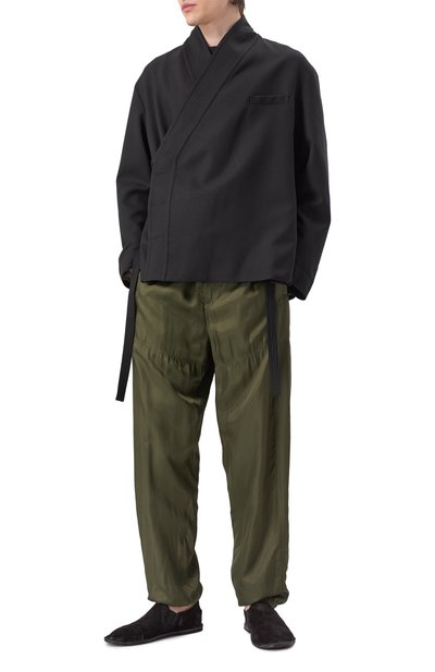 Пиджак со стегаными шалевыми лацканами, разрезами по бокам и ниспадающими лентами дополнили тремя карманами. Модель в стиле кимоно выполнили из чистой шерсти.