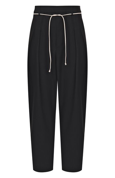 Для изготовления широких брюк с глубокими парными складками и боковыми карманами использовали тонкую шерсть. Модель дополнили контрастным шнуром, продетым в петли на эластичном поясе.