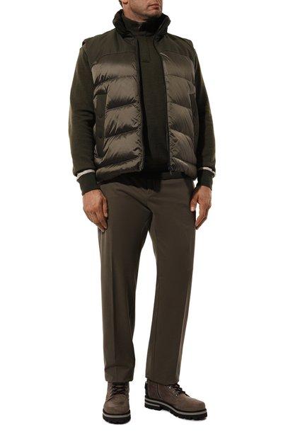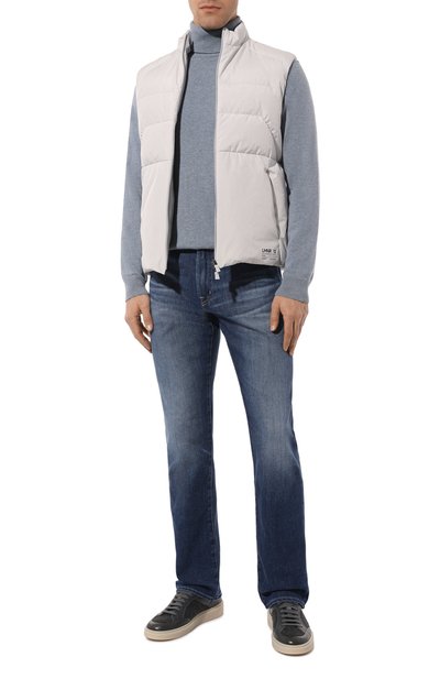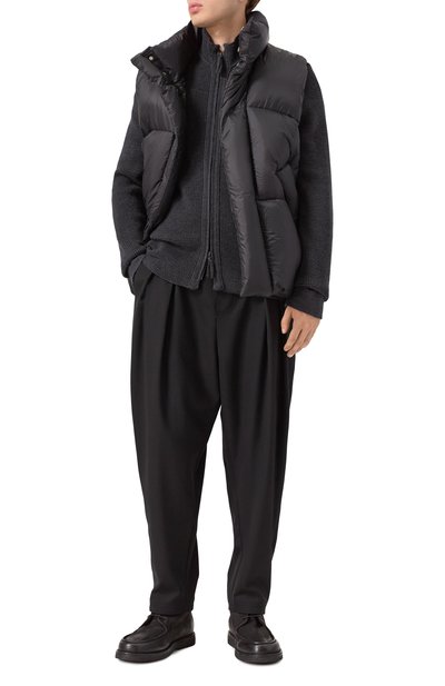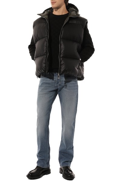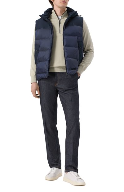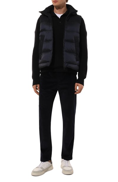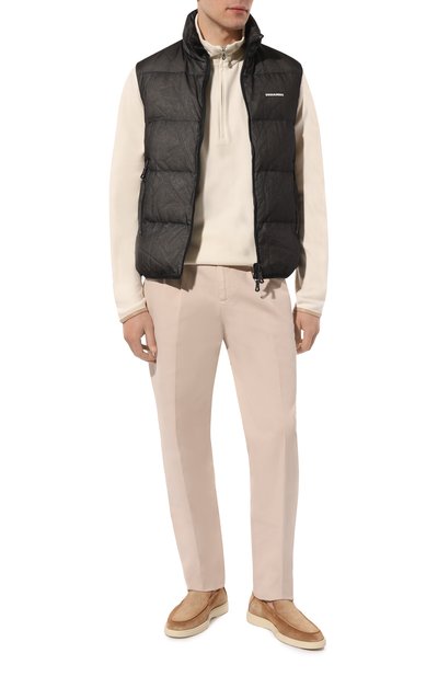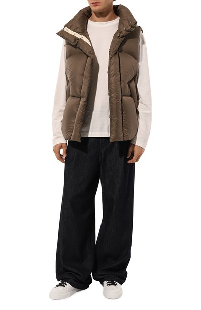 Нейлоновый жилет с потайной застежкой и высоким воротником-стойкой утеплили гусиным пухом и пером. Спинку украсили глянцевыми фирменными полосами, а по бокам предусмотрели карманы с широкими набивными листочками.