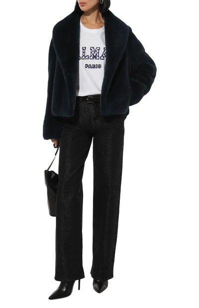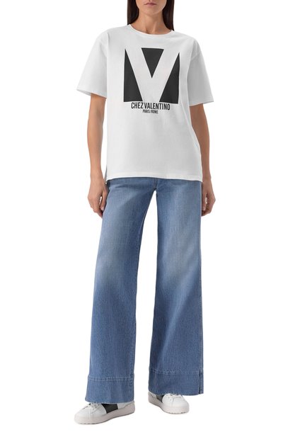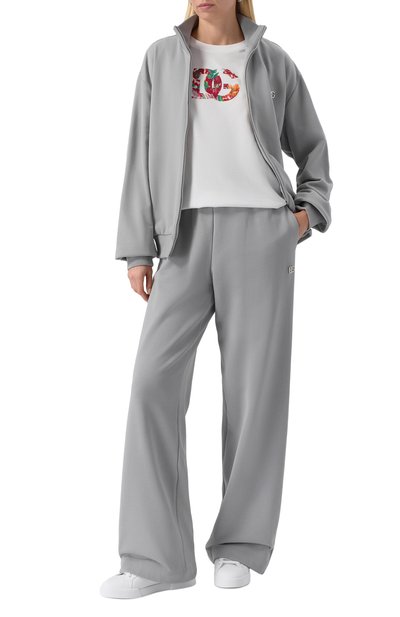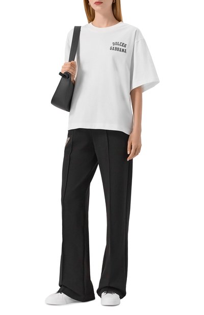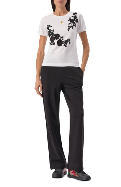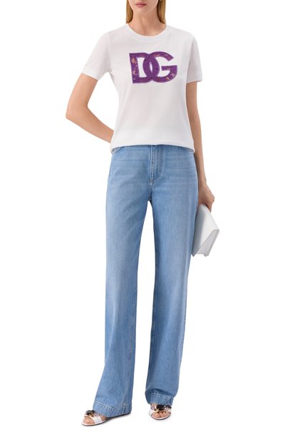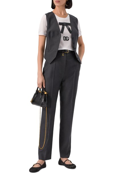 Футболку из хлопкового джерси украсили лентой, которая пересекает спинку, а спереди формирует аппликацию в виде банта. Контрастный декор поддержали вышитой монограммой DG.