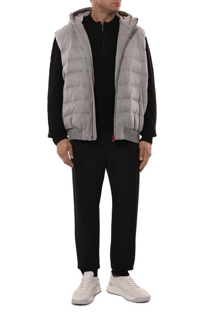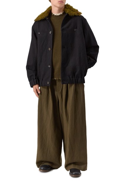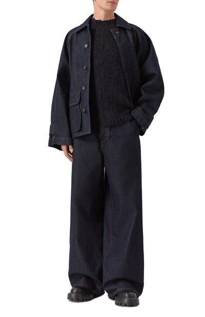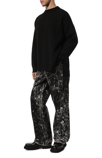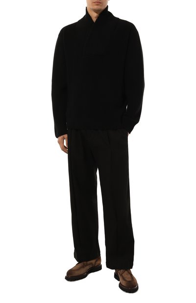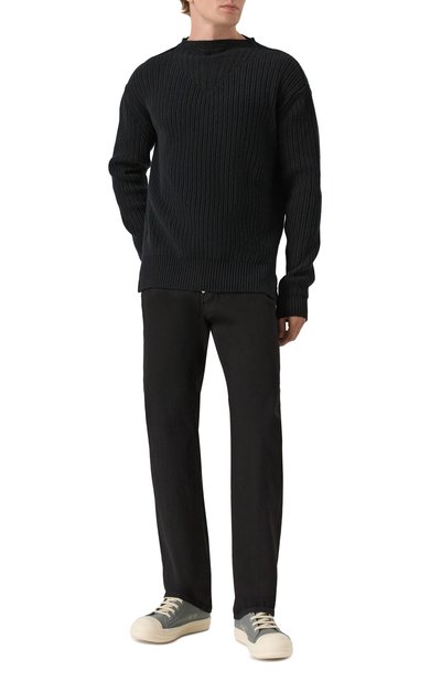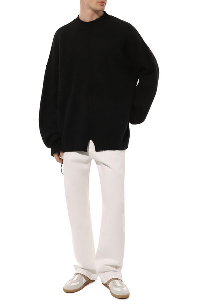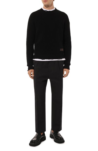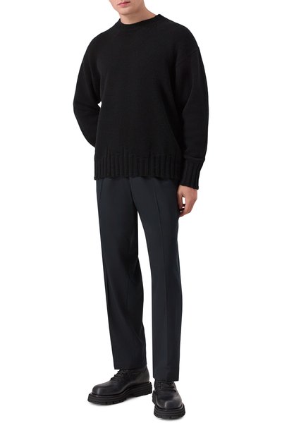 Свитер с заниженной линией плеч связали из кашемировой пряжи. Модель с рельефными швами декоративно состарили при помощи спущенных петель на горловине, манжетах и поясе в рубчик.