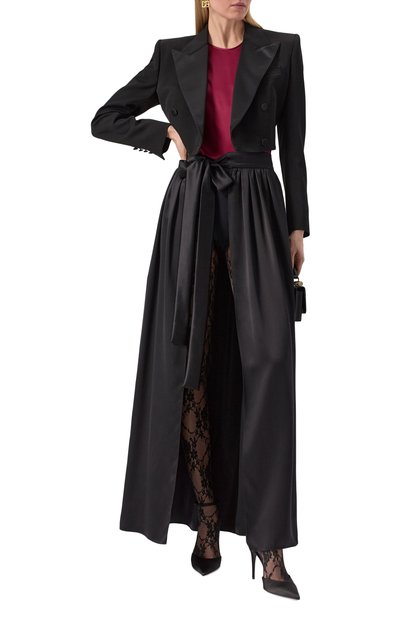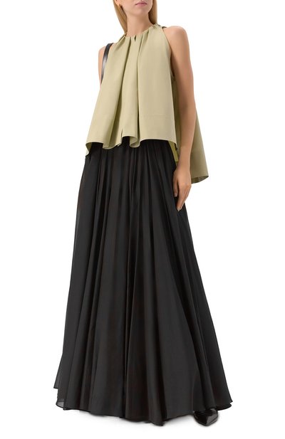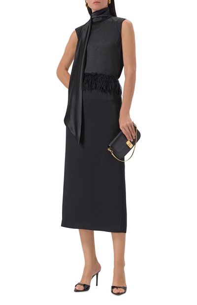 Для изготовления топа Achille с разрезом сзади использовали блестящий атлас из полиэстера. Высокий воротник-стойку дополнили длинными лентами, которые можно стилизовать разными способами.