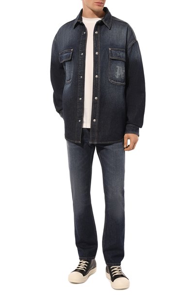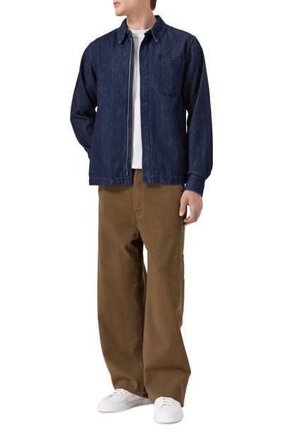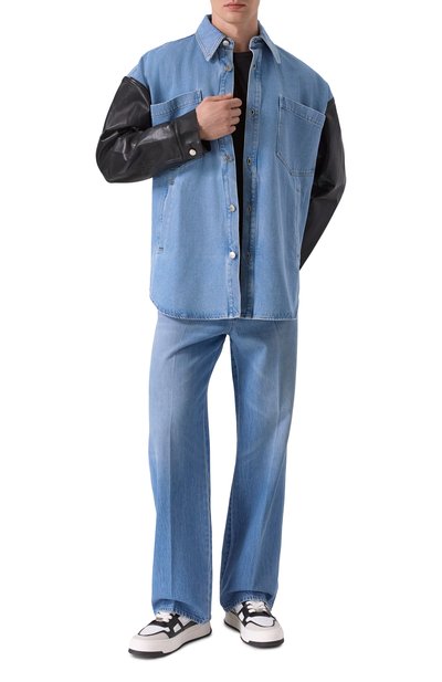 Рубашку силуэта oversize, прошитую строчкой табачного оттенка, выполнили из тонкого денима. Модель с фигурным низом и закругленными манжетами дополнили накладными нагрудными карманами с клапанами на пуговицах.