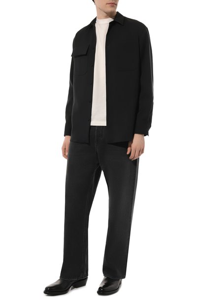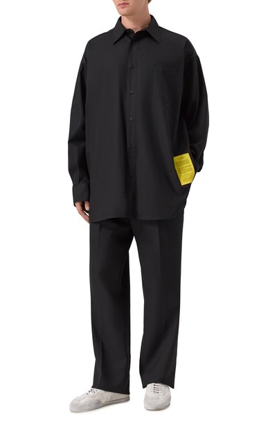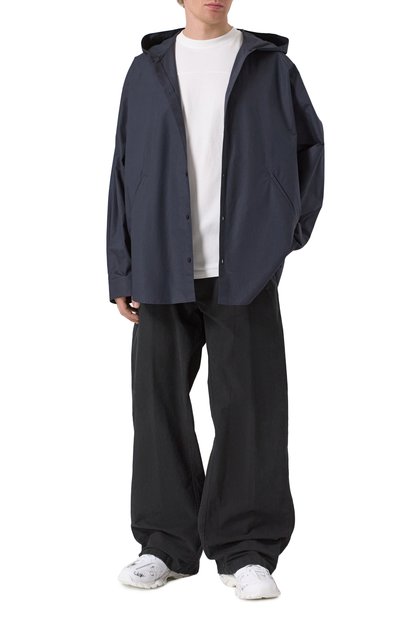 Для пошива рубашки со слегка спущенной линией плеч использовали шерстяной твил. Модель с нагрудным накладным карманом застегивается пуговицей на воротнике и молнией, скрытой под штормовой планкой.