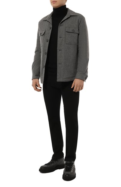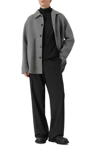 Для создания водолазки использовали гладкий трикотаж из шерсти мериноса. Однотонную модель без декора дополнили высоким воротником, манжетами и поясом в рубчик.