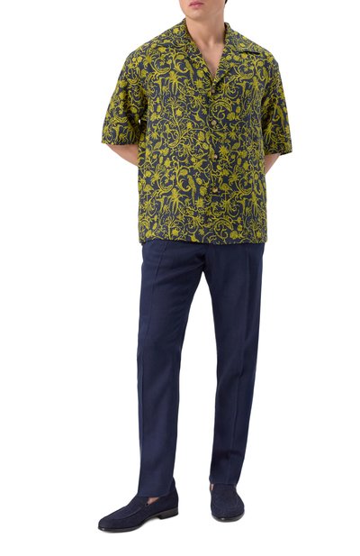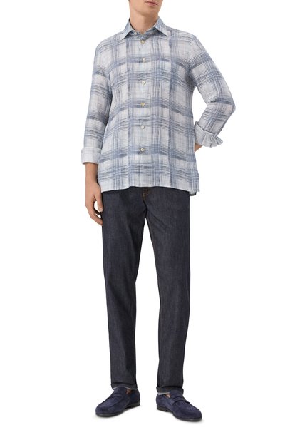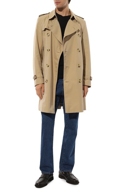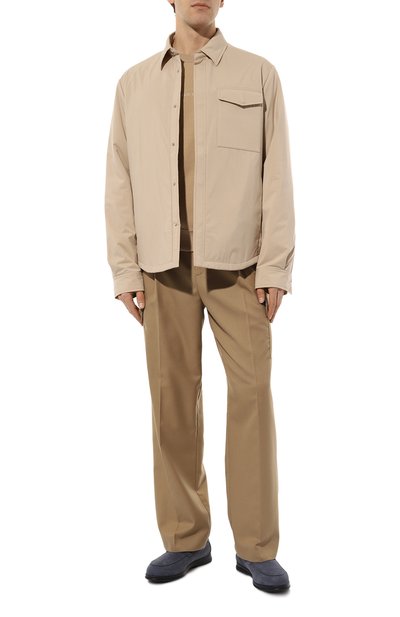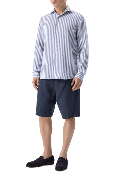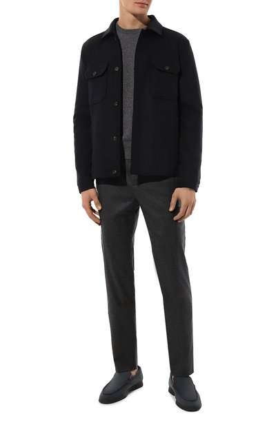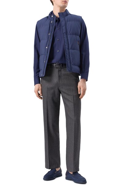 Лоферы с текстильным подкладом сшили из замши, подчеркнув миндалевидный мыс и вырез кожаным кантом. Туфли с широкой перемычкой установили на резиновую подошву.