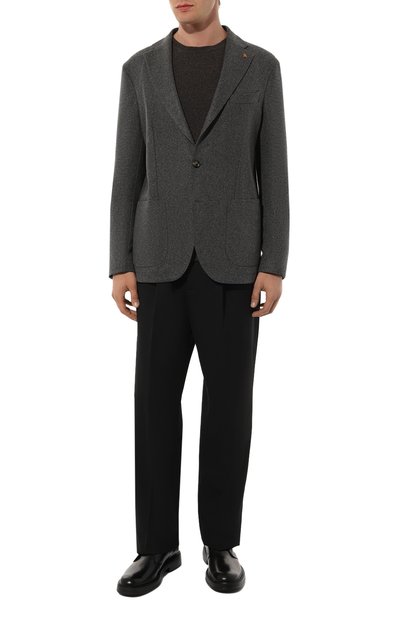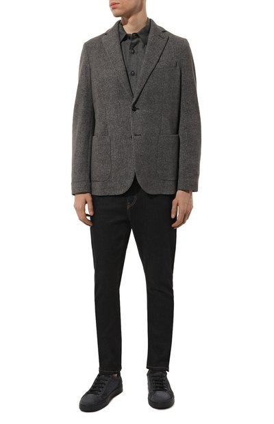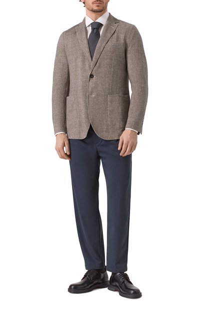 Пиджак с прямоугольными лацканами и парой шлиц сзади дополнили тремя карманами. Для изготовления модели в клетку гленчек использовали эластичный хлопок.