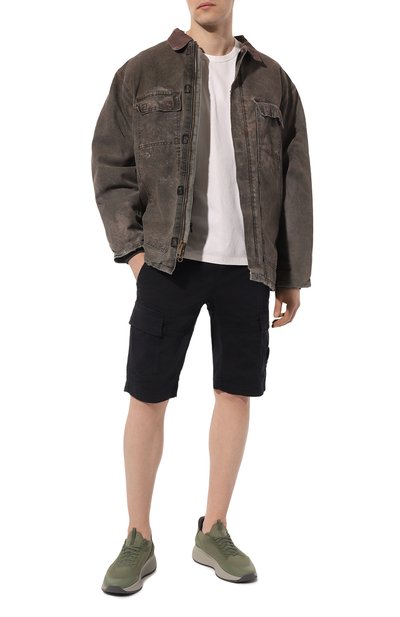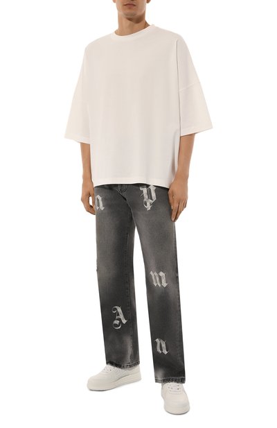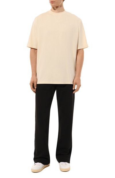 Для пошива футболки свободного кроя использовали хлопковый трикотаж. Модель с круглым вырезом и спущенной линией плеч украсили логотипом марки спереди и эмблемой сзади.