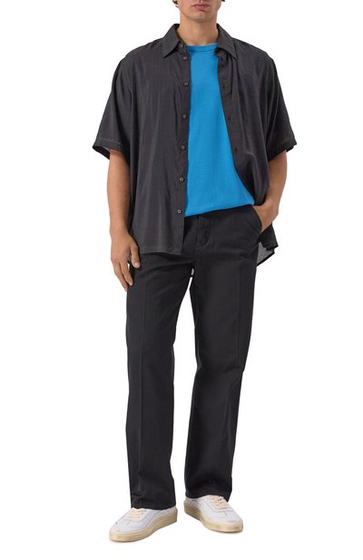Брюки с эластичным поясом и тремя карманами выполнили из хлопкового трикотажа. Окрашенную в готовом виде модель с необработанным низом украсили рельефным логотипом.