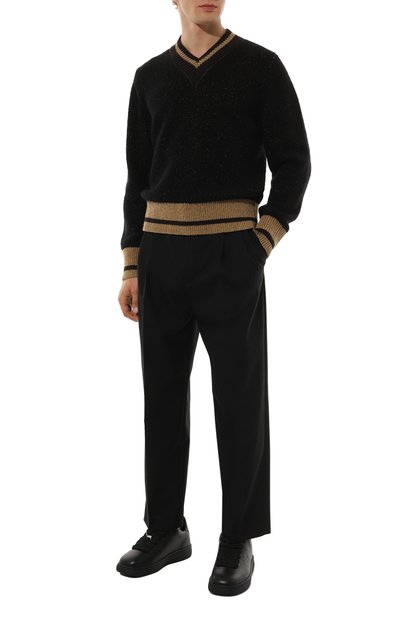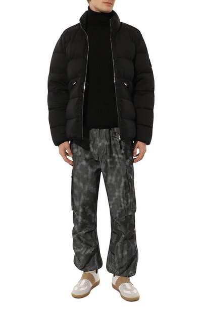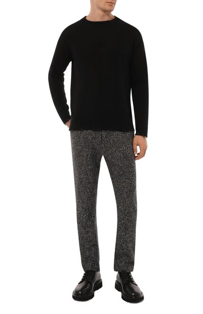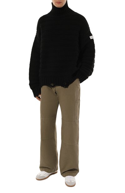Свитер со спущенными петлями украсили контрастным вышитым логотипом сзади. Oversize-модель связали английской резинкой из шерстяной пряжи с добавлением полиакрила.