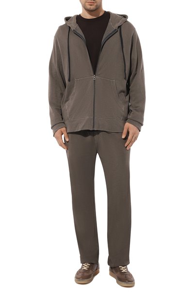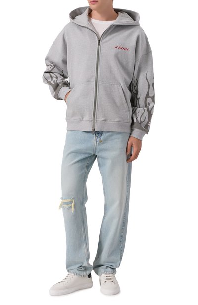 Толстовка асимметричного кроя сшита из хлопкового трикотажа. Модель с капюшоном, накладными карманами и необработанными швами украшена сзади повторяющимися логотипами и эмблемой марки.