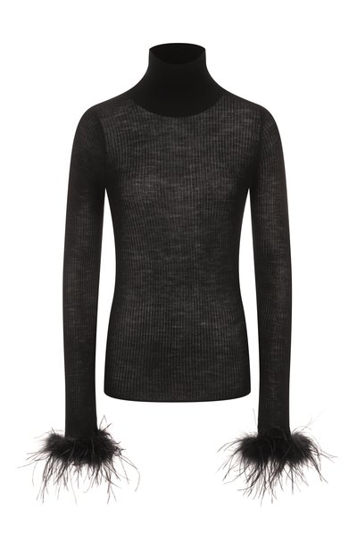 Облегающую водолазку с высокой горловиной выполнили из тонкого шерстяного трикотажа в рубчик. Модель дополнили акцентными манжетами из перьев в тон.