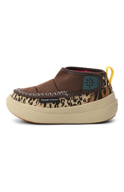 Для изготовления ботинок с внутренней флисовой отделкой использовали комбинацию нейлоновой ткани и искусственной замши с анималистичными принтами. Модель с петлей на заднике и застежкой велкро сбоку установили на широкую подошву с рифленой аутсолью.