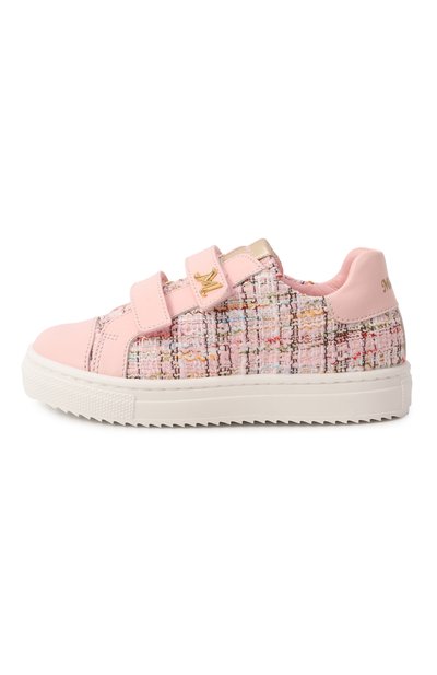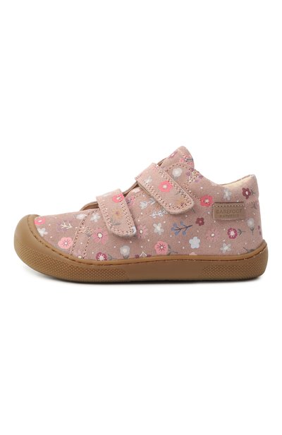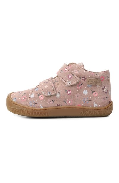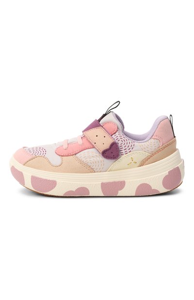 Кеды с петлями на язычке и заднике выполнили из принтованного текстиля и полиуретана, напоминающего замшу. Модель с ремешком велкро установили на широкую подошву с паттерном в виде сердец.