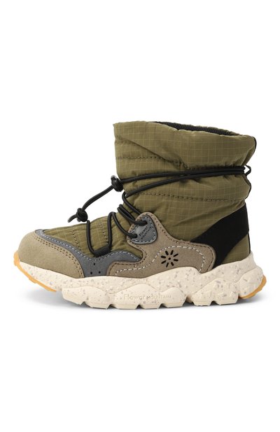 Сапоги Kuki с текстильным утеплителем выполнили из искусственной замши и нейлонового рипстопа. Модель с фиксатором на шнурках и антибактериальной пробковой стелькой установили на широкую подошву с шипованным протектором.