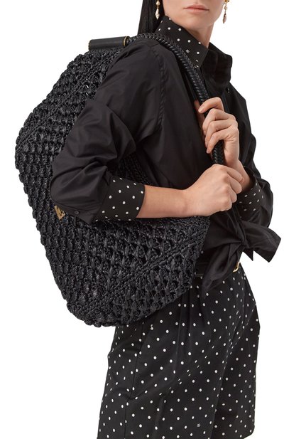 Сумку Sicily с венским плетением изготовили из двух видов кожи: козьей и телячьей. Модель с пуклями на дне и двумя узкими ручками украсили брендированной надписью спереди. В комплекте — съемная косметичка на молнии.