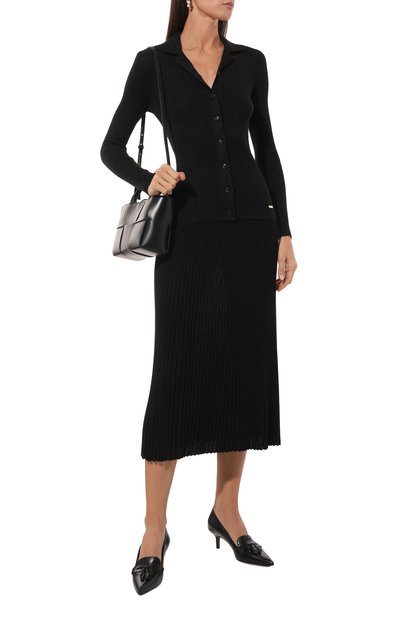 Кардиган из шерсти первого пострига декорировали несъемными брошами с отделкой из кристаллов и жемчужных бусин. Над эластичным поясом вышили миниатюрную монограмму DG в тон. Модель с круглой горловиной в рубчик застегивается атласными пуговицами.