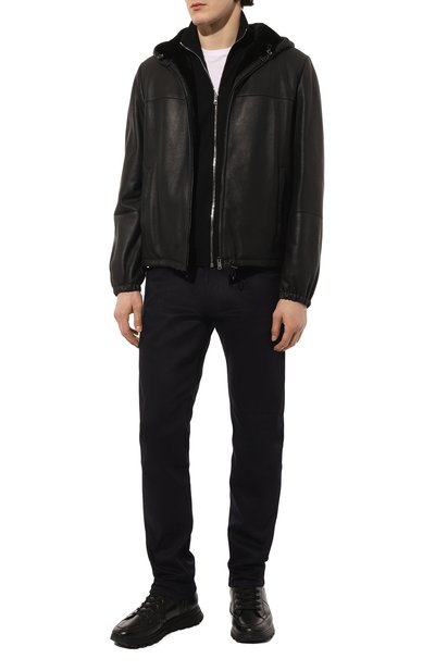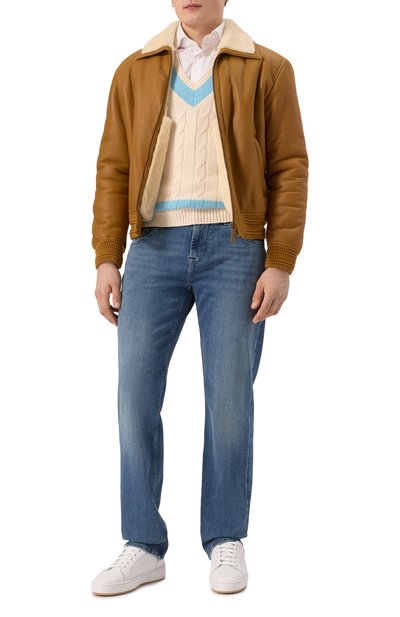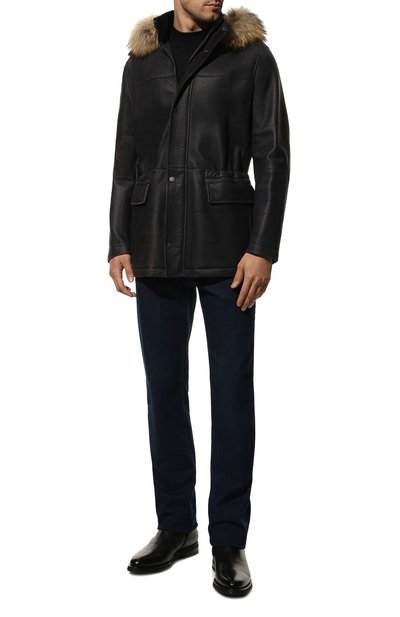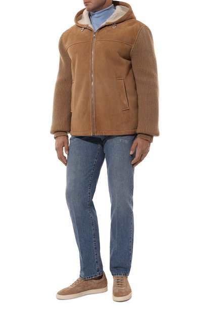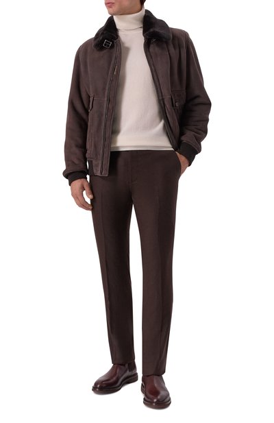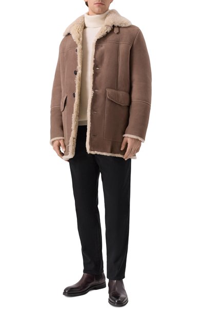Укороченную дубленку на молнии выполнили из овчины. Пояс, манжеты, широкий воротник и швы подчеркнули контрастным мехом. По бокам предусмотрели крупные карманы.