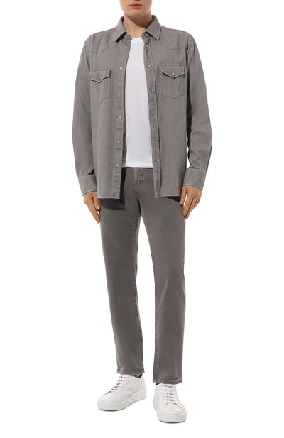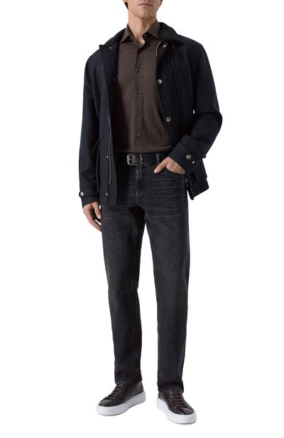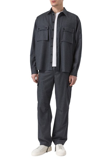 Рубашку с удлиненной спинкой сшили из фланели на основе шерсти первого пострига с добавлением хлопка. Модель дополнили нагрудными карманами на пуговицах, украсив левый брендированным патчем.